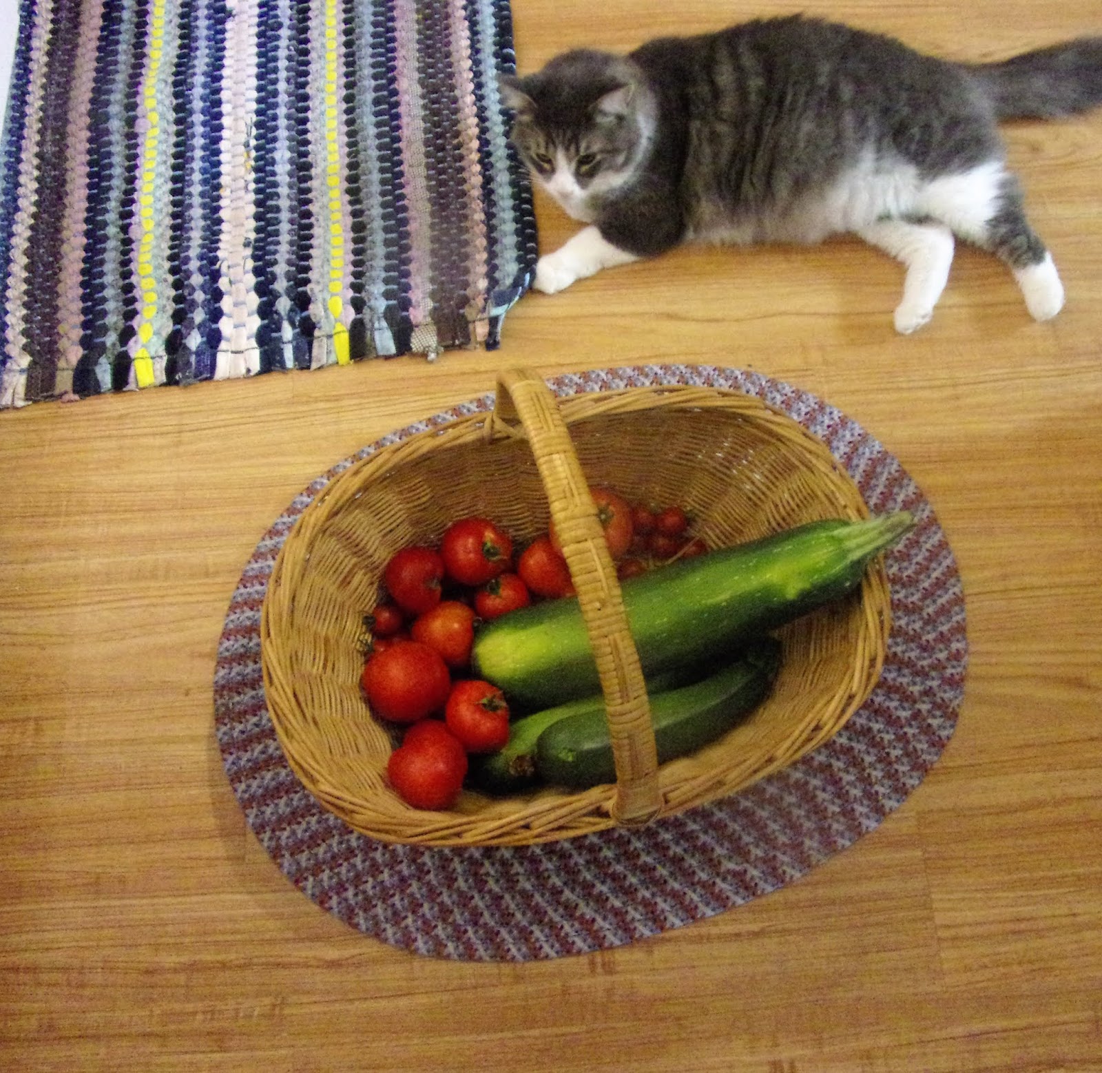 tomatoes are ripe! Smokie just had to get in on the picture taking!