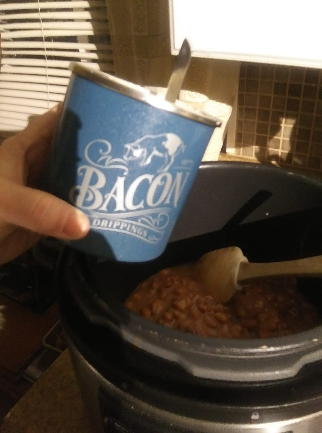 Then I add some bacon fat that I saved in the refrigerator. Today I had about 1 1/2 tsp in my jar. Then I put the crockpot on high for about 4 or 5 hours. Believe me they taste just as good as homemade!